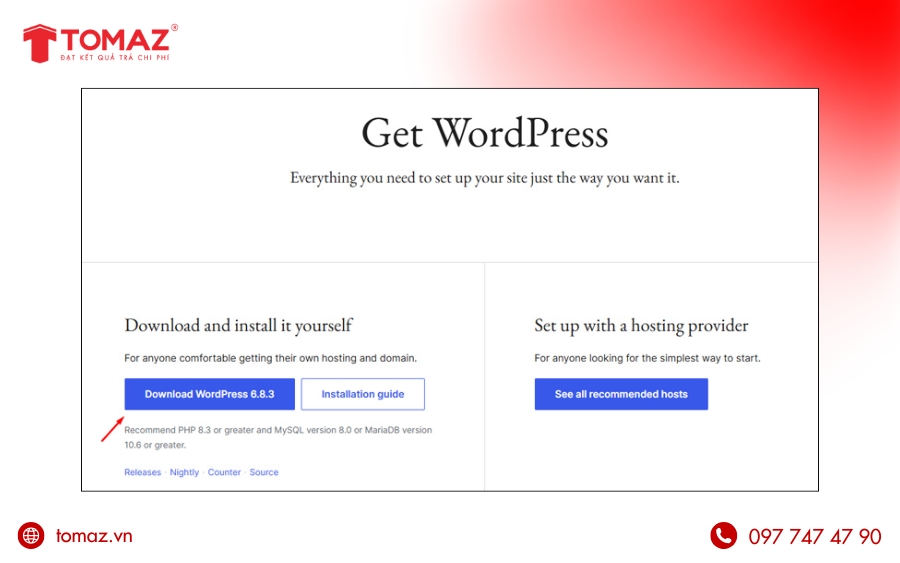Truy cập trang tải WordPress chính thức và download WordPress mới nhất về máy tính.