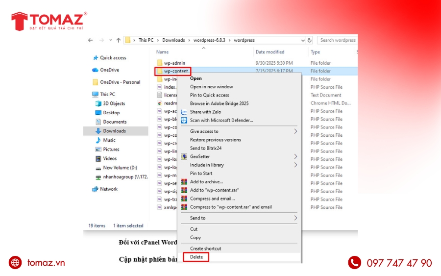 Giải nén file vừa tải → mở thư mục wordpress → xóa thư mục wp-content để tránh ghi đè theme, plugin và media của website hiện tại.