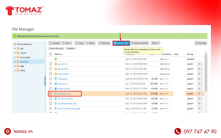Trong File Manager, chọn file .zip vừa upload → Extract (Giải nén).