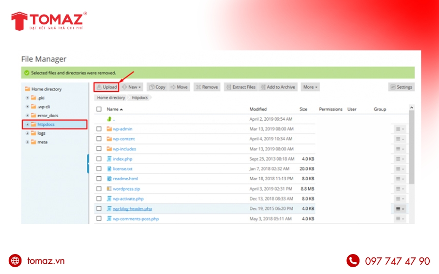 Upload file .zip vừa chuẩn bị → giải nén → di chuyển/ghi đè toàn bộ file WordPress ra thư mục chính httpdocs.