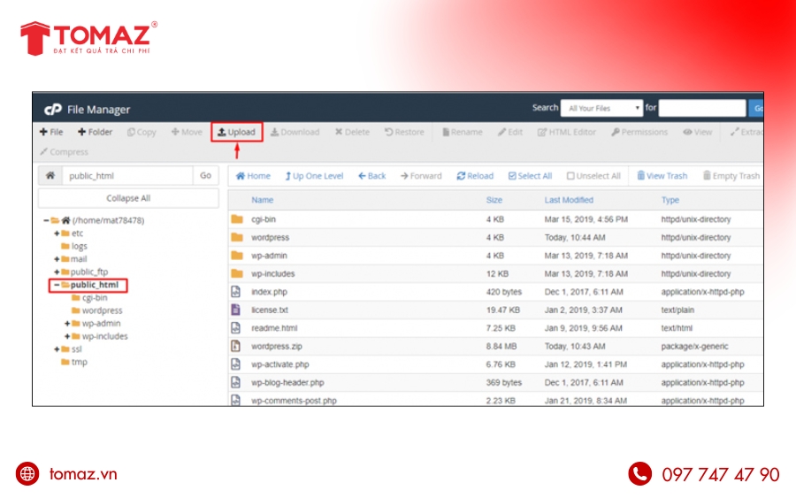 Tiếp theo, đăng nhập cPanel → File Manager → truy cập thư mục website (thường là public_html) → upload file .zipWordPress đã chuẩn bị.