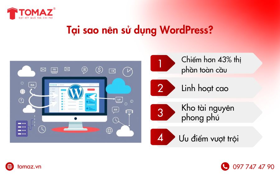WordPress là gì? Đây là một hệ thống quản lý nội dung (CMS) mã nguồn mở phổ biến nhất thế giới, giúp người dùng dễ dàng tạo và quản lý các website WordPress từ blog cá nhân, trang doanh nghiệp đến cửa hàng trực tuyến. Với giao diện thân thiện, kho plugin và theme phong phú, website WordPress là gì nếu không phải là giải pháp lý tưởng cho cả người mới bắt đầu và lập trình viên chuyên nghiệp? Bài viết này, TOMAZ sẽ phân tích chi tiết về WordPress là gì, các ứng dụng thực tiễn, ưu và nhược điểm, cũng như lý do tại sao nên chọn WordPress để xây dựng website.