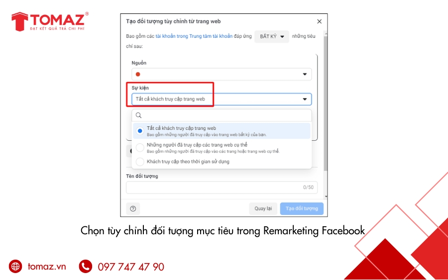 Ví dụ minh họa: Nếu một khách hàng đã xem sản phẩm trên website nhưng chưa thực hiện giao dịch, bạn có thể sử dụng tùy chọn “Trang web” để hiển thị quảng cáo về sản phẩm đó trên Facebook, nhắc nhở họ quay lại và hoàn tất đơn hàng. Cách làm này không chỉ tăng khả năng khách hàng trở lại mà còn nâng cao hiệu quả của mỗi đồng chi phí quảng cáo.