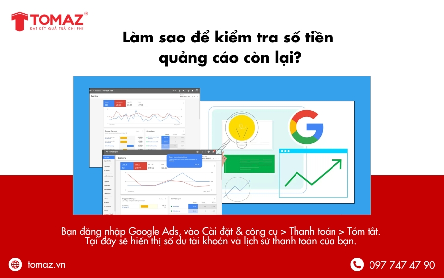 Để biết số tiền quảng cáo còn hay hết, nếu bạn được hỗ trợ từ một nhà quảng cáo, hãy nhờ họ theo dõi và báo cáo chi phí theo từng chiến dịch. Nếu bạn tự chạy quảng cáo, bạn có thể đăng nhập vào tài khoản Google Ads, sau đó chọn mục Cài đặt và công cụ, rồi chọn Tóm tắt trong mục Thanh toán. Trang này sẽ hiển thị số dư của bạn.