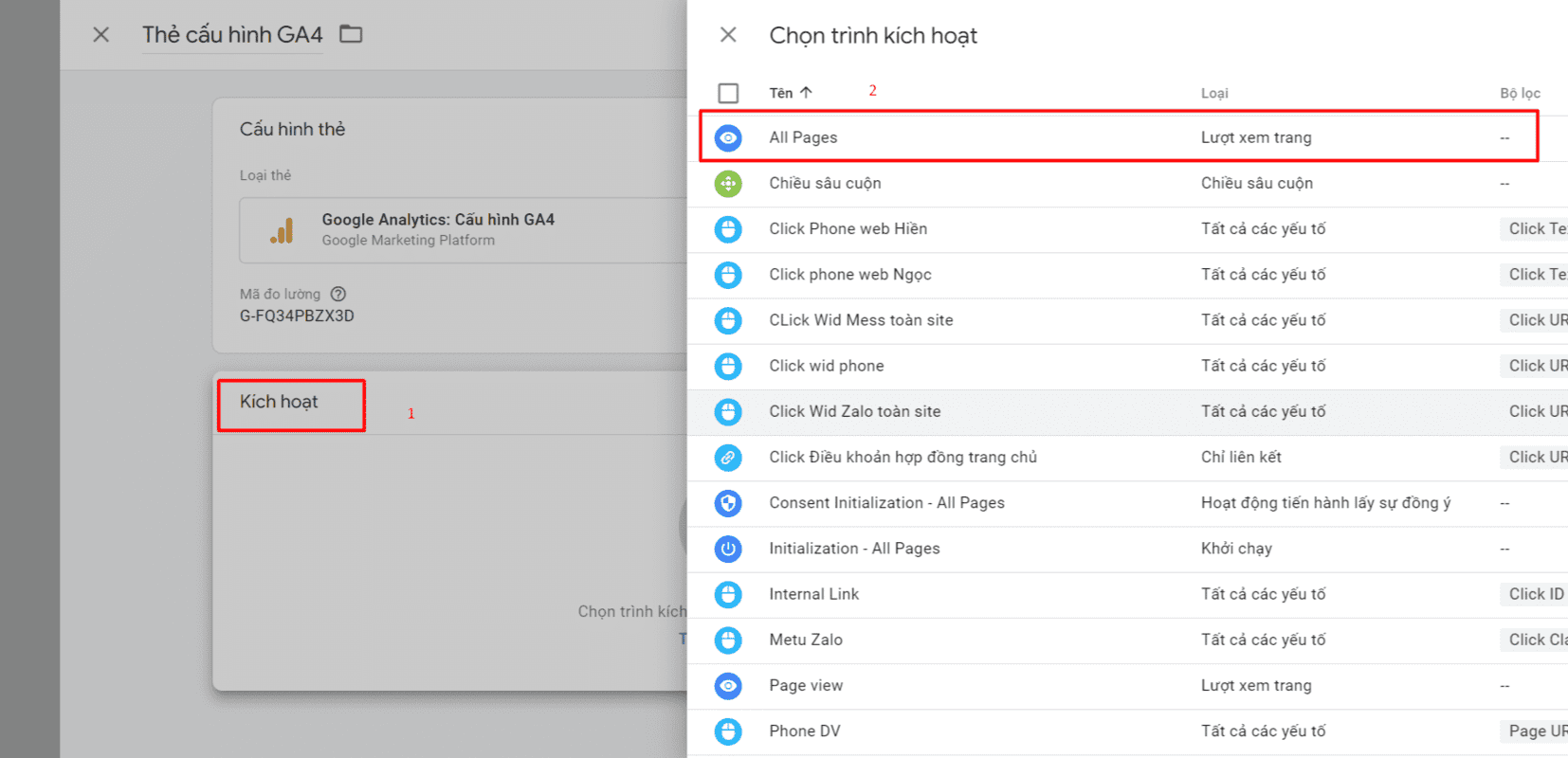Bước 7: Ở phần Kích hoạt (Triggering), chọn All Pages để thẻ được áp dụng trên toàn website, sau đó nhấn Lưu.
