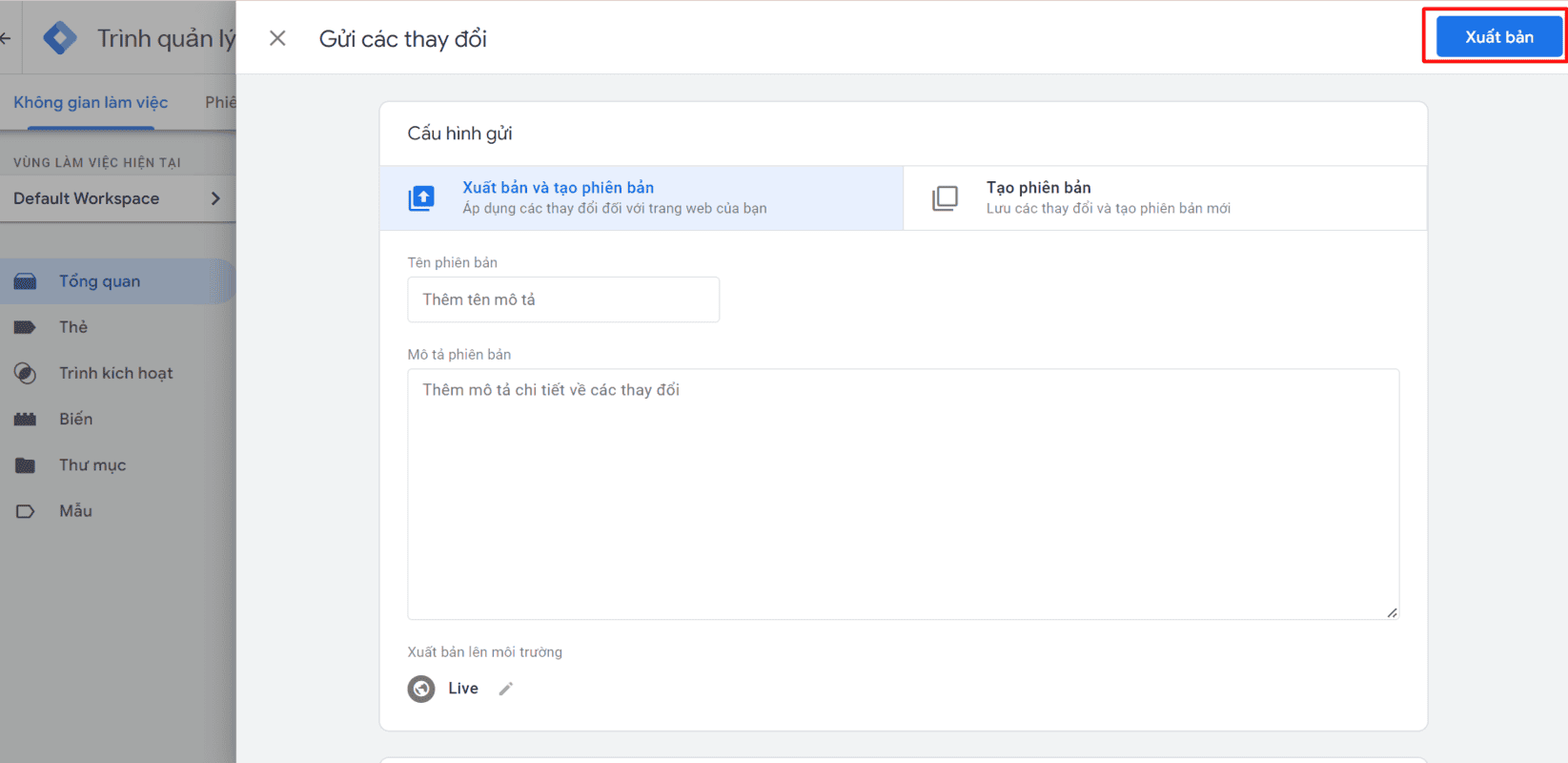 - Khi tất cả tag, trigger và biến đã hoạt động chính xác, nhấn Publish để xuất bản các thay đổi và triển khai lên website.