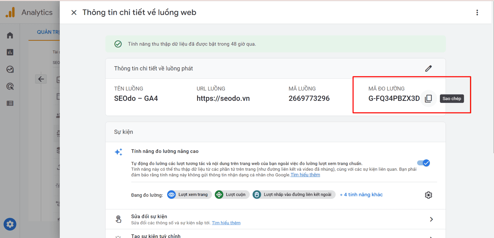 - Truy cập Chi tiết luồng dữ liệu trên web trong GA4 và sao chép ID đo lường.