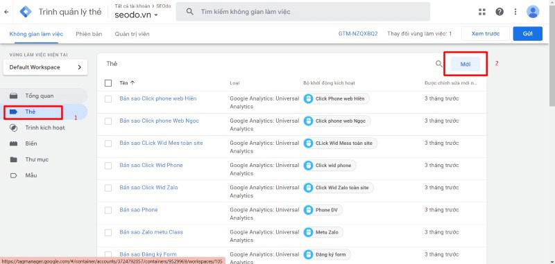 - Sau khi thêm thẻ, cần nhấn GỬI để GTM cập nhật.