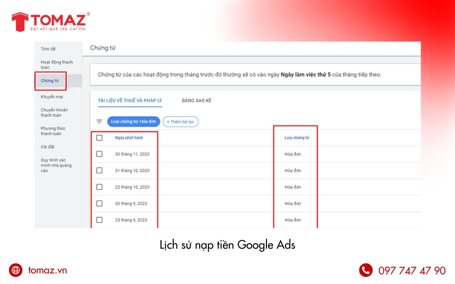 Tại đây, bạn sẽ dễ dàng tra cứu toàn bộ lịch sử thanh toán, tải về hóa đơn chi tiết cho từng giao dịch, giúp việc quản lý tài chính quảng cáo trở nên minh bạch và tiện lợi hơn.