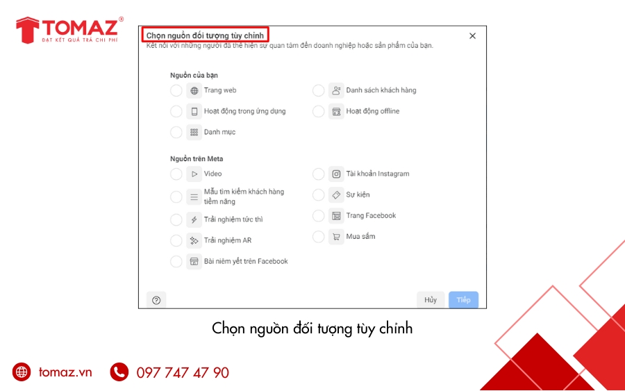 Ở bước này, bạn cần chọn một tùy chọn nguồn dữ liệu để tạo đối tượng tùy chỉnh. Về bản chất, đối tượng tùy chỉnh là trung tâm của mọi chiến dịch remarketing Facebook, vì nó cho phép bạn nhắm quảng cáo trực tiếp đến nhóm khách hàng đã từng tương tác với sản phẩm hoặc dịch vụ của bạn.